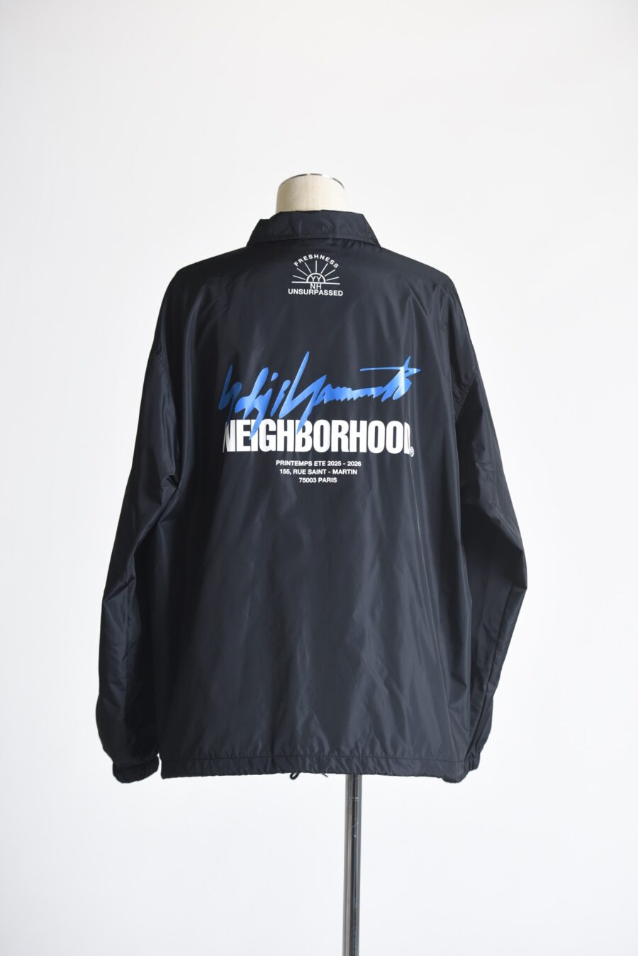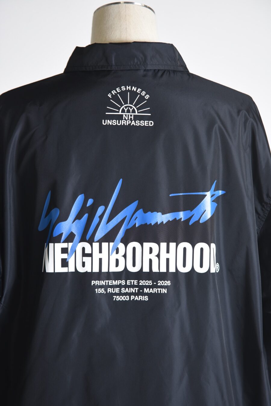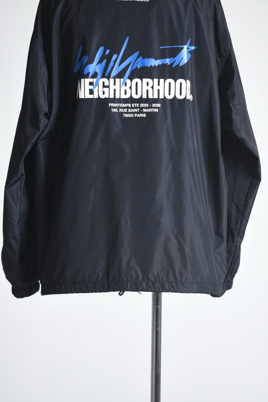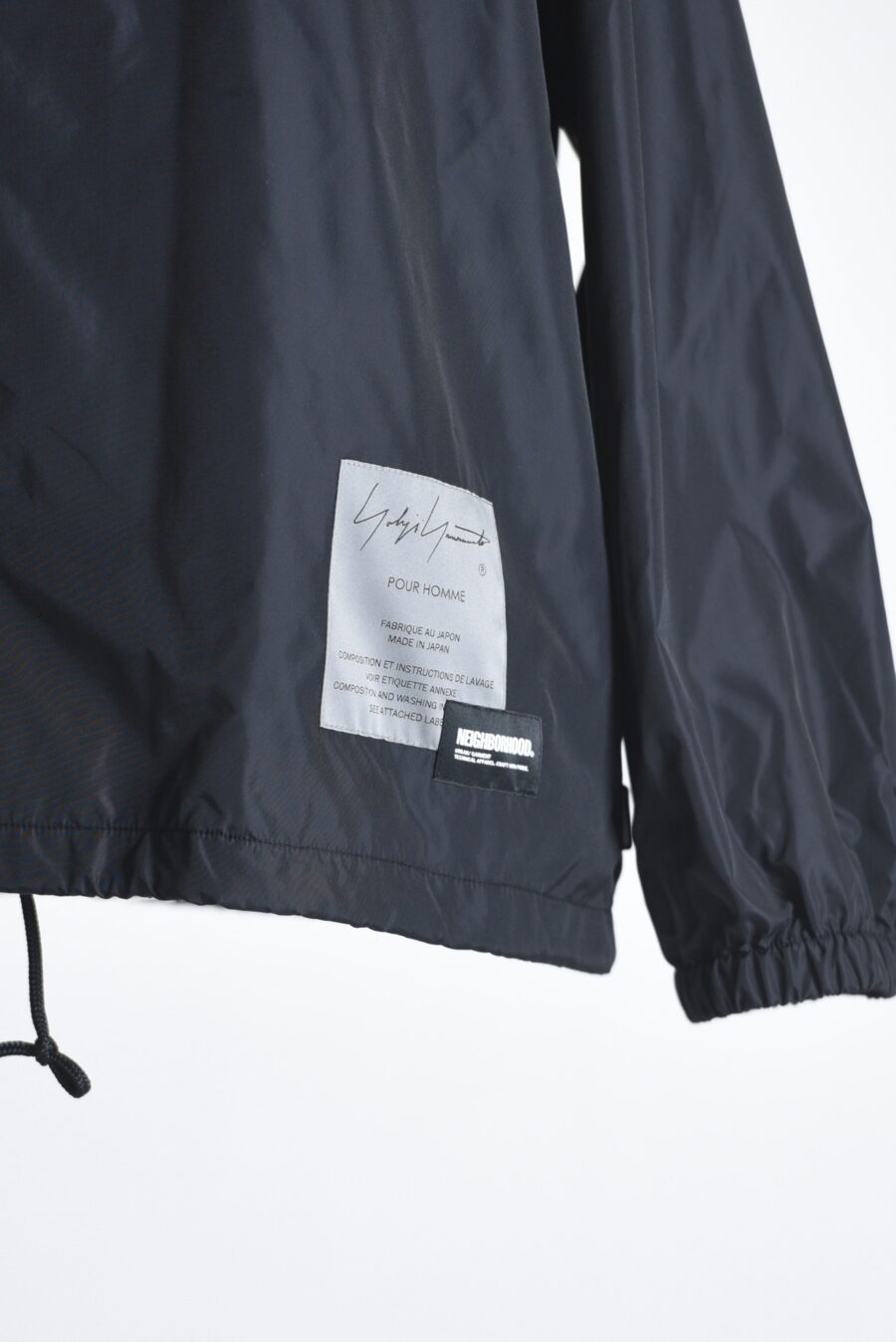 Yohji Yamamoto POUR HOMME × NEIGHBORHOOD 2025A/W ・WINDBREAKER JACKET Item 光沢のあるナイロンタフタ生地で仕立てた 防風性と保温性のあるコーチジャケットです。 各ブランドのロゴとグラフィックを各所にプリントし、 スナップボタンやジップはオリジナルのアイテムを採用しています。 裏地には身頃に肌触りの良いコットンの天竺生地を、 袖裏には袖通しの良いポリエステルのタフタ生地を用いております。 夏場以外の幅広いシーズンでご利用いただけます。 Material Main : Nylon 100% Lining : Cotton 100% Sleeve Lining : Polyester 100% Size Size:5 着丈76cm 身幅69cm 肩幅58cm 袖丈64cm Product Code HK-Y91-600
