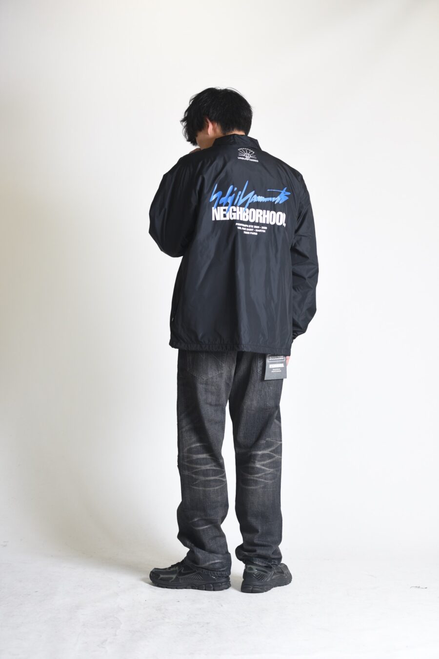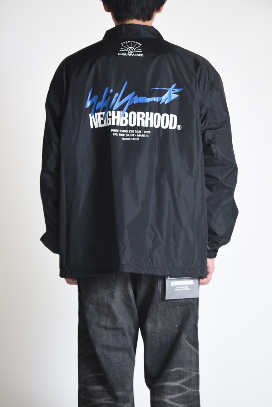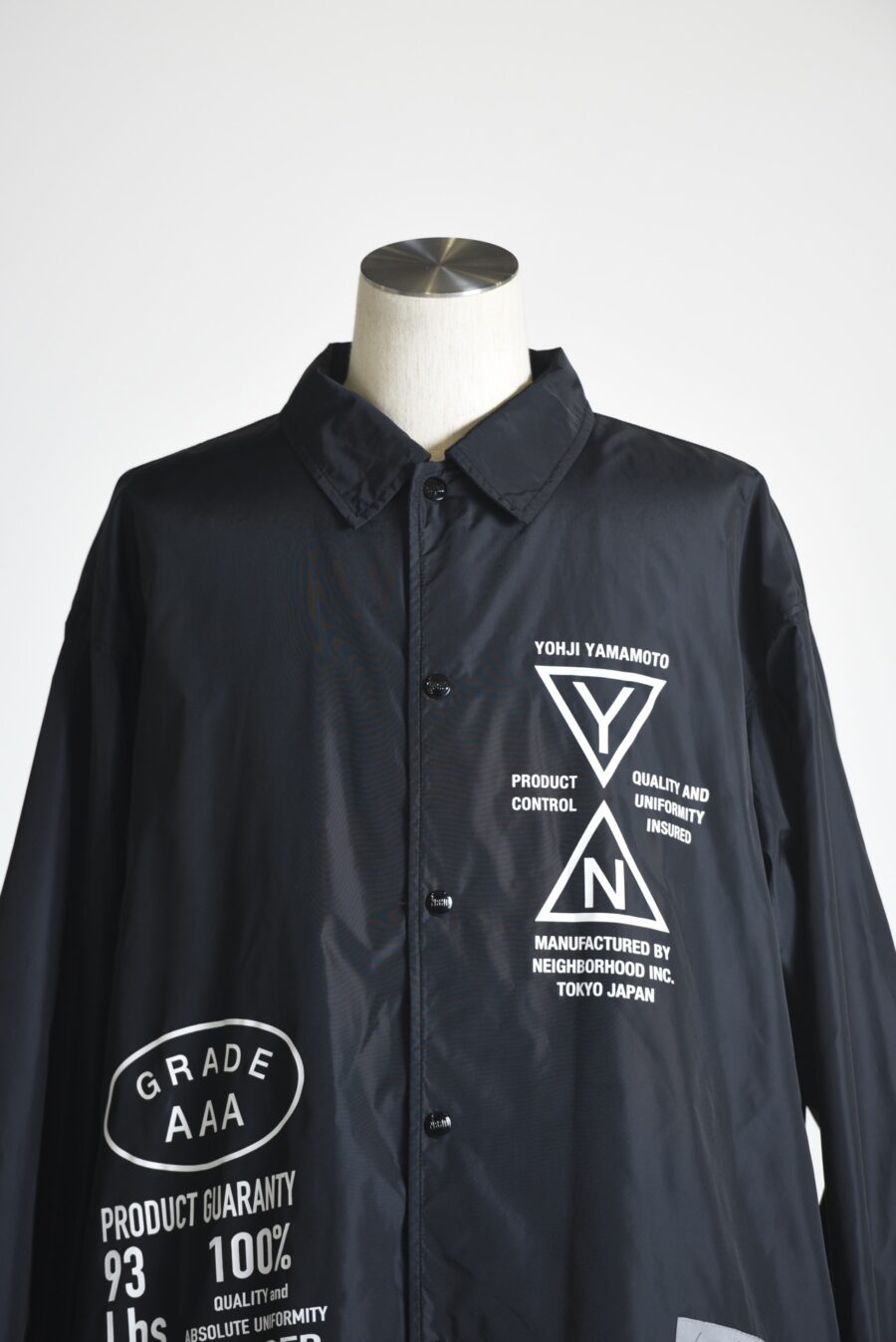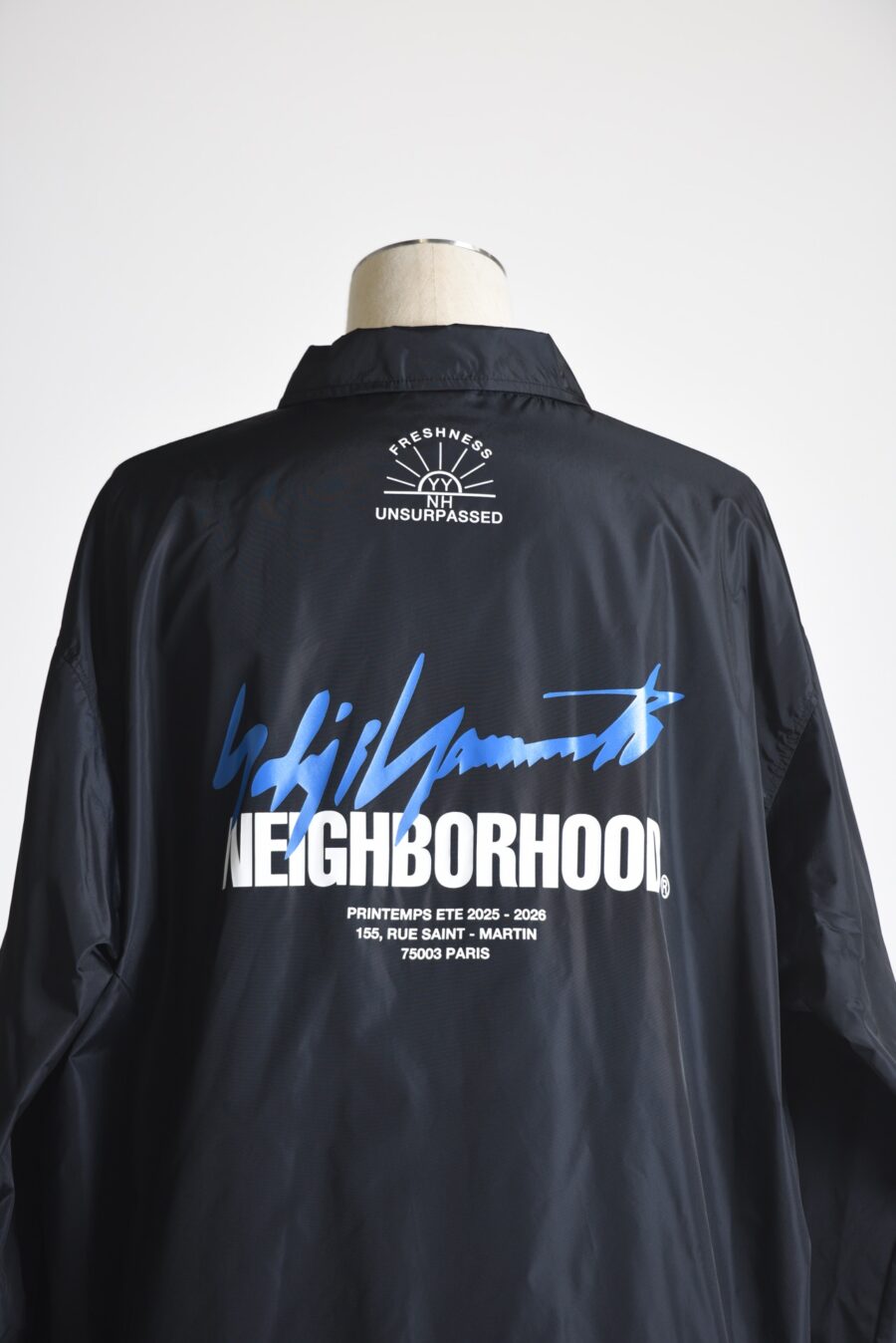 Yohji Yamamoto POUR HOMME × NEIGHBORHOOD 2025A/W ・WINDBREAKER JACKET Item 光沢のあるナイロンタフタ生地で仕立てた 防風性と保温性のあるコーチジャケットです。 各ブランドのロゴとグラフィックを各所にプリントし、 スナップボタンやジップはオリジナルのアイテムを採用しています。 裏地には身頃に肌触りの良いコットンの天竺生地を、 袖裏には袖通しの良いポリエステルのタフタ生地を用いております。 夏場以外の幅広いシーズンでご利用いただけます。 Material Main : Nylon 100% Lining : Cotton 100% Sleeve Lining : Polyester 100% Size Size:5 着丈76cm 身幅69cm 肩幅58cm 袖丈64cm Product Code HK-Y91-600
